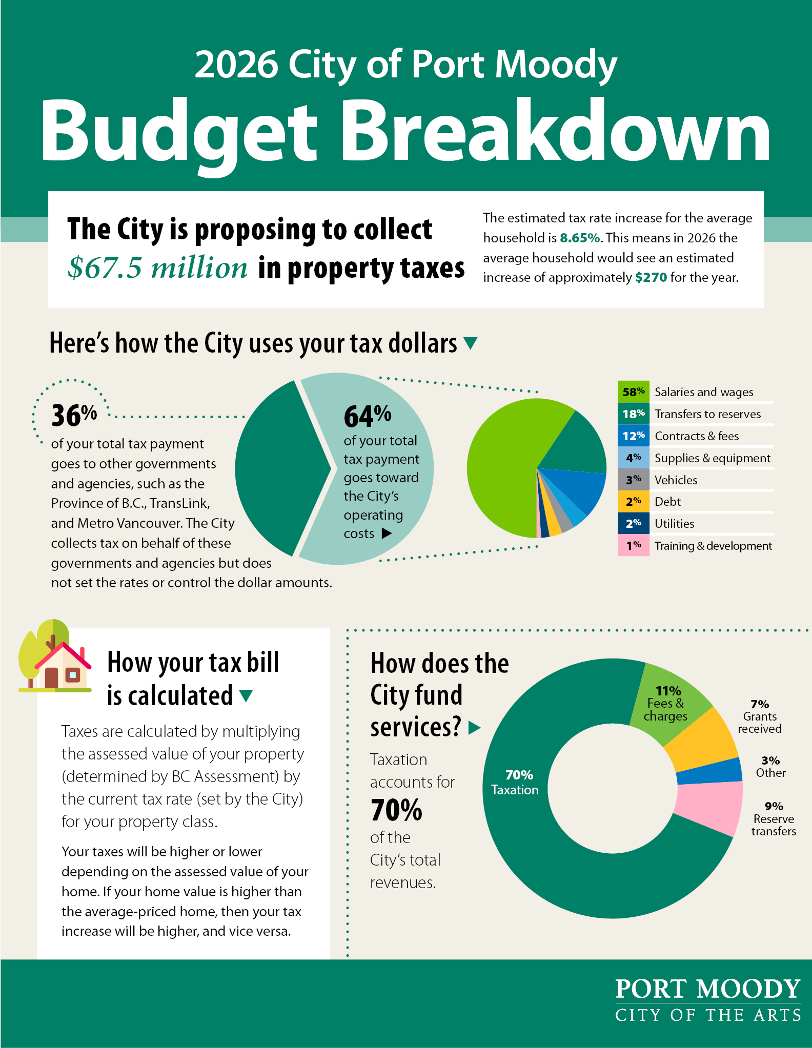 In 2026, the City is proposing to collect $67.5 million – approximately $5.67 million more than in 2025 – in property taxes from residents and businesses to balance the budget. The estimated tax rate increase for the average household is currently being proposed at 8.65 per cent. This means in 2026 the average household would see an estimated increase of approximately $270 for the year – that’s $5.19 per week or $0.74 per day. “Average household” refers to a Port Moody residential property assessed by BC Assessment at the preliminary 2025 average amount of $1,291,000. The increase for each individual household will depend on the value of your property, as assessed by BC Assessment, and your change in assessed value relative to the average change in assessed value for all other households.