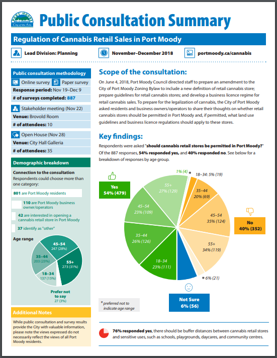 To prepare for the legalization of cannabis, the City of Port Moody asked residents and business owners/operators to share their thoughts on whether retail cannabis stores should be permitted in Port Moody and, if permitted, what land use guidelines and business licence regulations should apply to these stores.